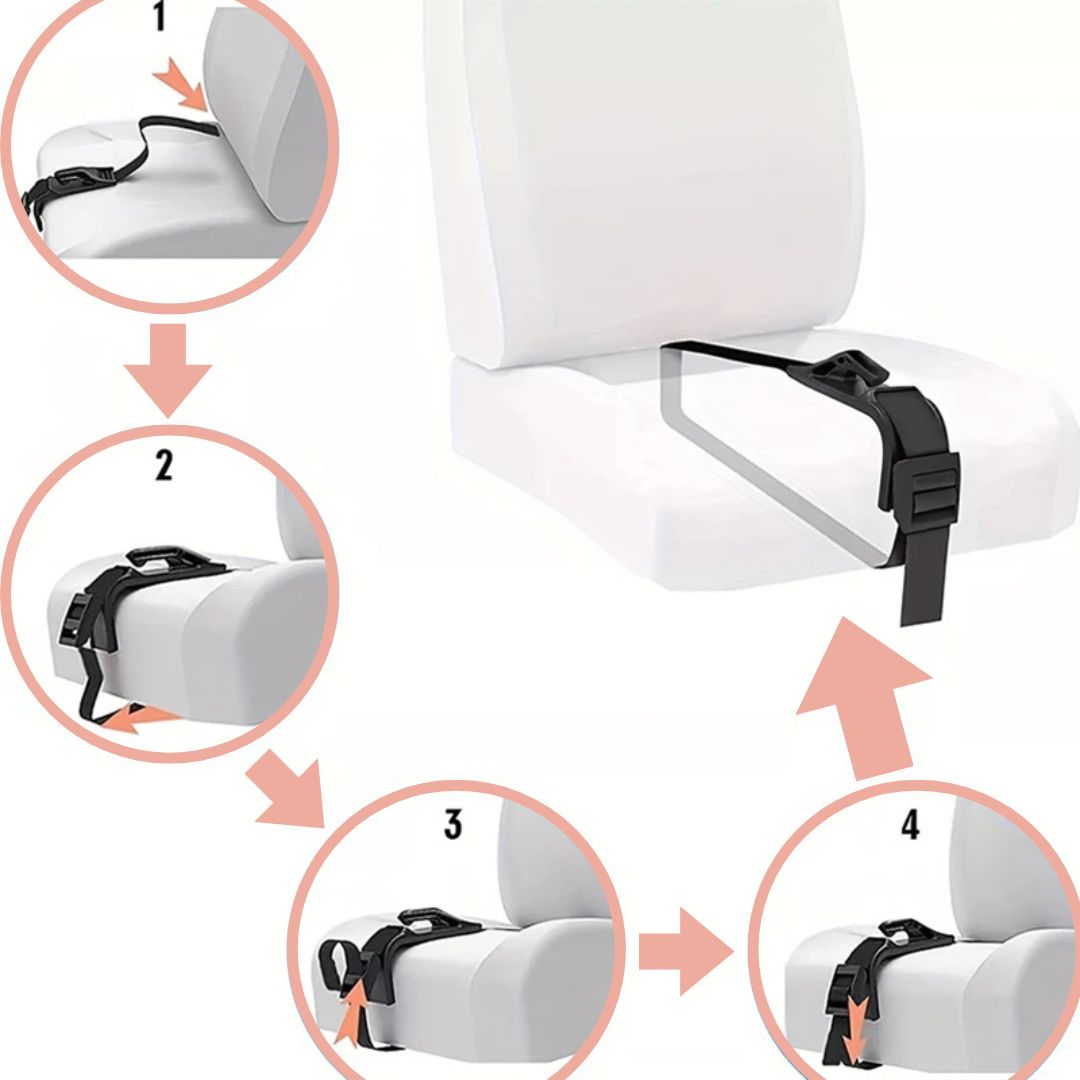 It installs in under a minute—strap under the seat, tighten, clip—and its adjustable one-size fit works with most front seats and moves easily between cars. Reinforced core, soft-touch body.
